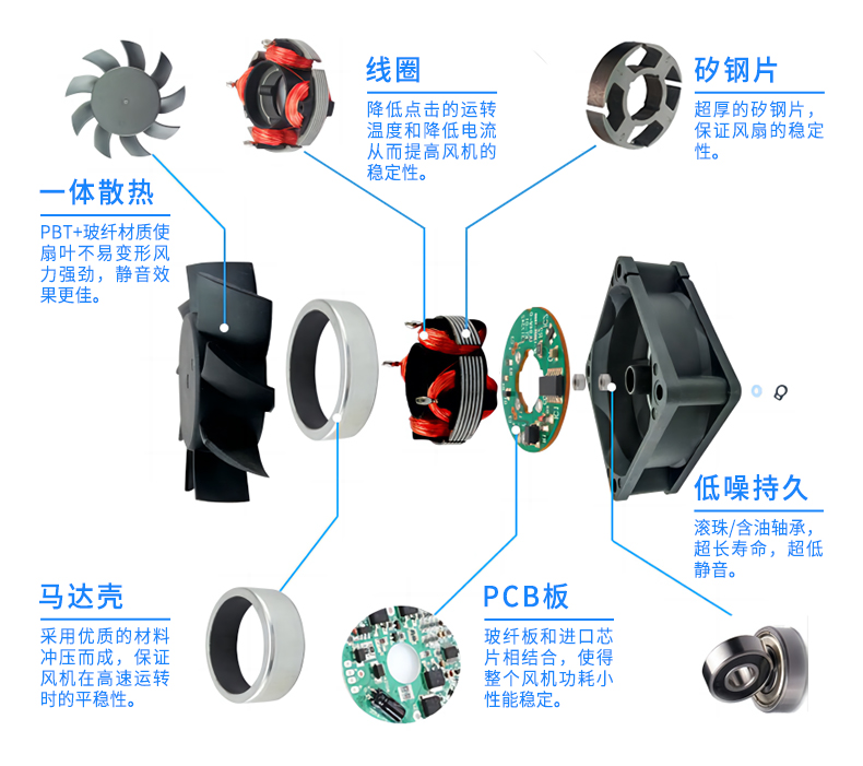 DC(Direct Current,直流)風(fēng)機指的是使用直流電源驅(qū)動的風(fēng)機,其電機通常是有刷或無刷直流電機。直流電源的電壓和電流波動較大,因此DC風(fēng)機的輸出功率和機械效率相對較低,但可實現(xiàn)更高的轉(zhuǎn)速和更小的尺寸。同時,DC風(fēng)機在低速、低負載運行時具有很好的扭矩性能和控制性能,應(yīng)用于電腦、通信設(shè)備、電動工具和小型家電等領(lǐng)域。