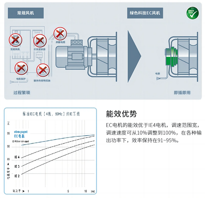 5.效率方面:EC風機相對于傳統(tǒng)的直流電機效率更高。