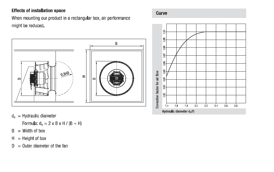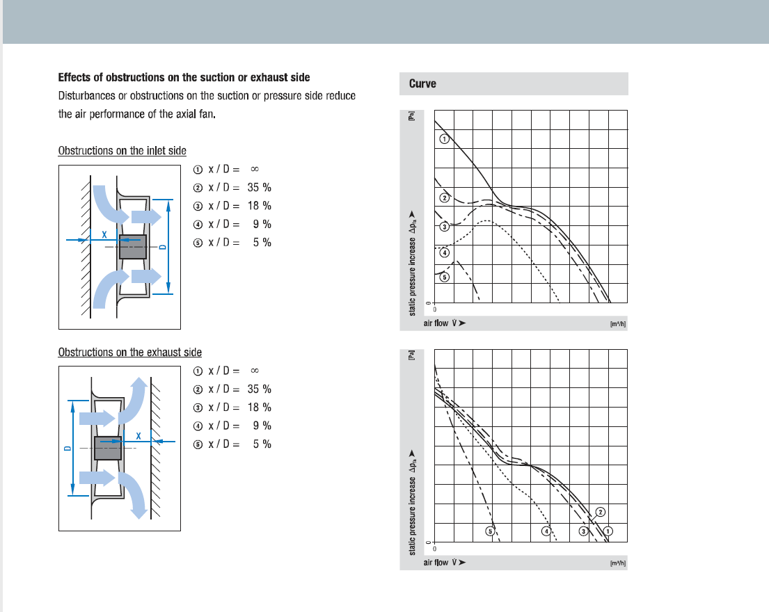 從以上性能圖表可以看出,無(wú)論是進(jìn)風(fēng)口還是出風(fēng)口,距離障礙物的距離均為葉輪直徑的35%以上是最佳